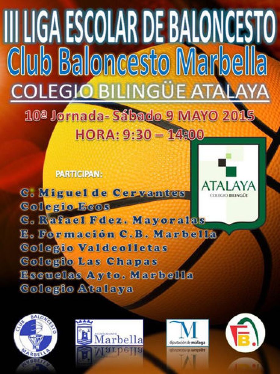 Este finde organizamos la 10 jornada de la Liga Escolar del Club Baloncesto Marbella. Nuestros equipos participan en la misma. A las 11:00 horas nuestro grupo Baby-PREMINI juega contra los Preminis Azulones y a las 13:00 horas vuelven a jugar, esta vez contra el Colegio Las Chapas. El grupo infantil Cadete juega tambien a las 13:00 horas contra el infantil del CB Marbella